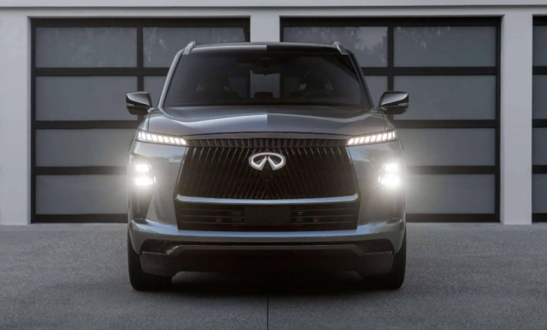 تمتلك سيارة Infiniti QX80 موديل 2025 الكثير من المميزات من ضمنها، شبك جريء وعناصر إضاءة أنيقة، وبها أضواء متصلة على عرض السيارة، وبها لمسات من الكروم الداكن.